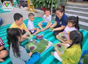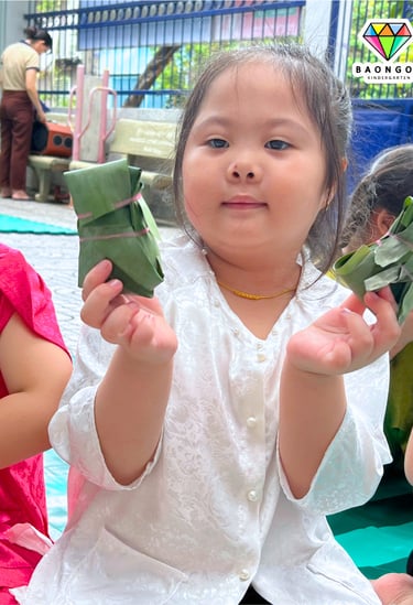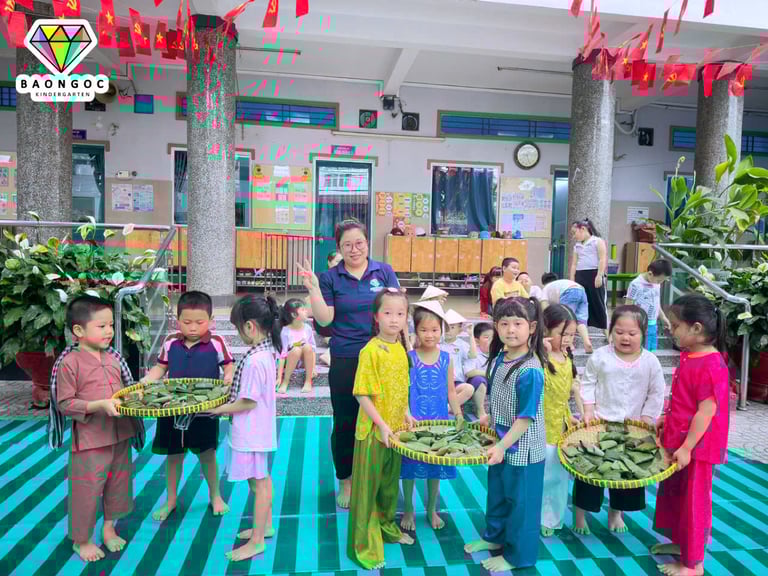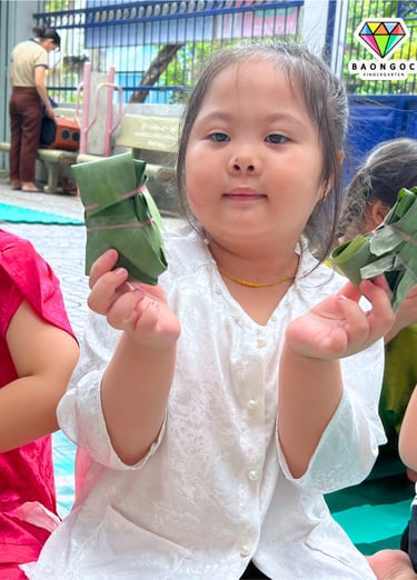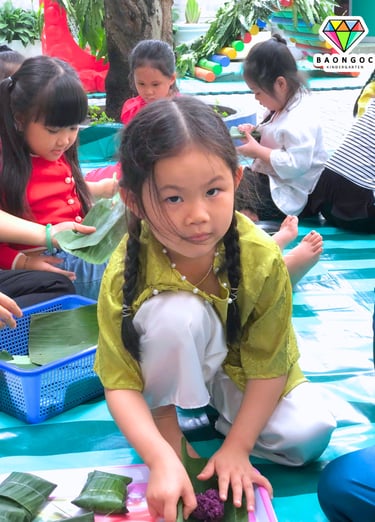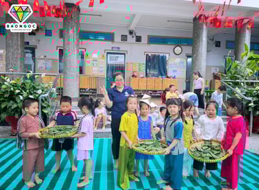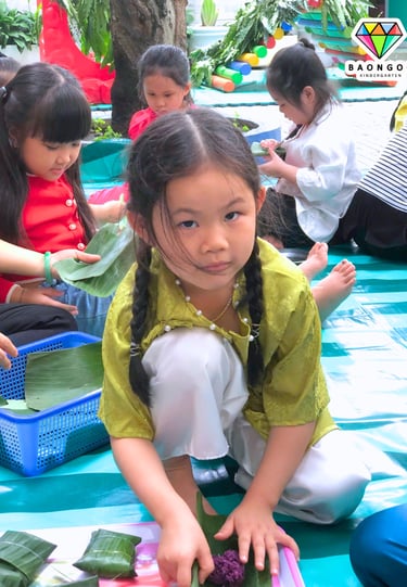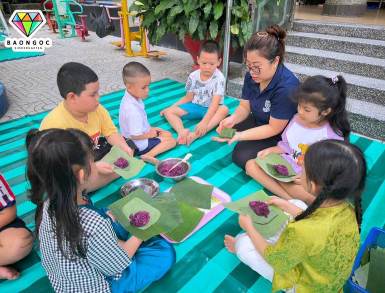 🍙 Trong hoạt động, bé được tìm hiểu về hình ảnh những chiến sĩ năm xưa – khi ra trận không có túi ni lông hay đồ dùng hiện đại, mà chỉ sử dụng lá cây để gói cơm nắm và lương thực khô. Từ đó, các con được trực tiếp thực hành vo cơm, nắm cơm và gói bằng lá, vừa khéo léo lại vừa hào hứng.
