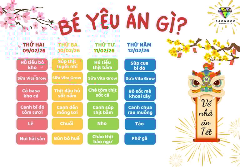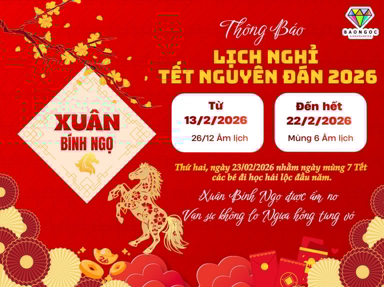📢 Trường Mầm non Bảo Ngọc xin thông báo đến quý phụ huynh và các bé lịch nghỉ Tết Nguyên Đán Bính Ngọc như sau: