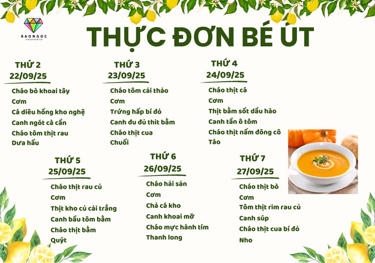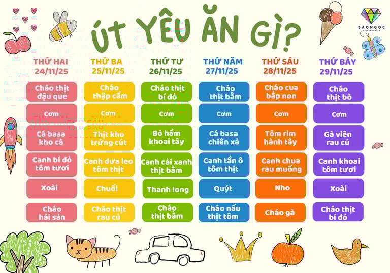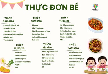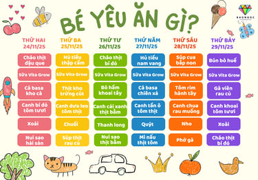 Khẩu phần ăn phong phú đáp ứng dinh dưỡng và năng lượng cho bé hoạt động vui chơi và học tập một ngày.