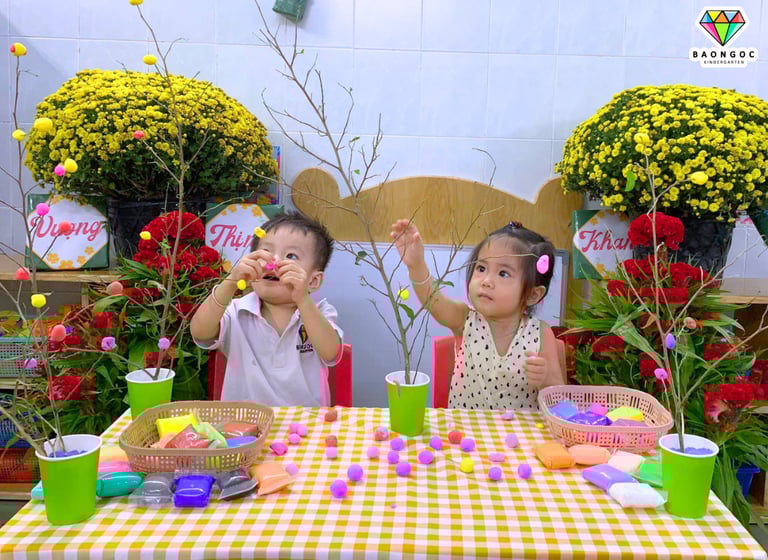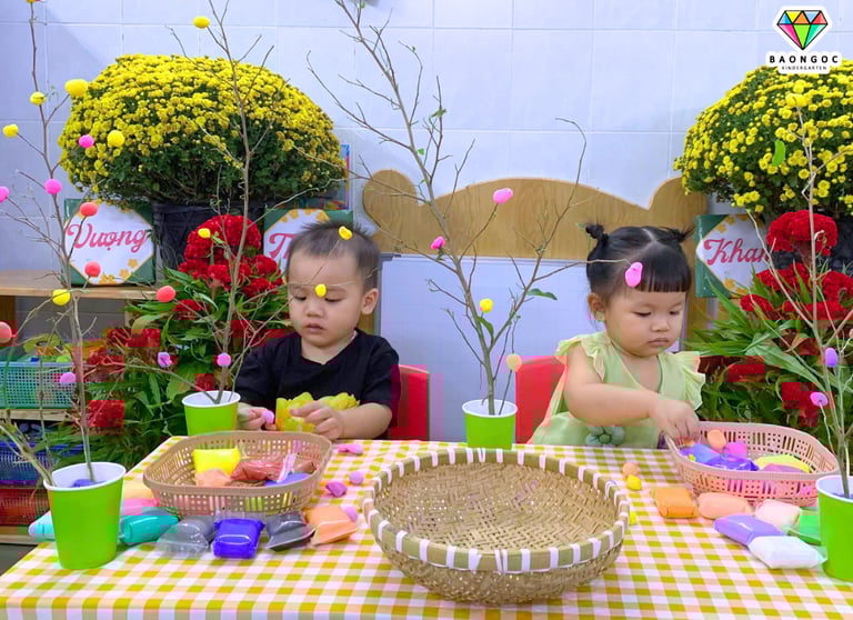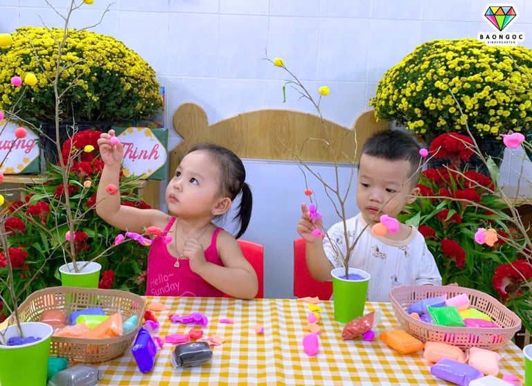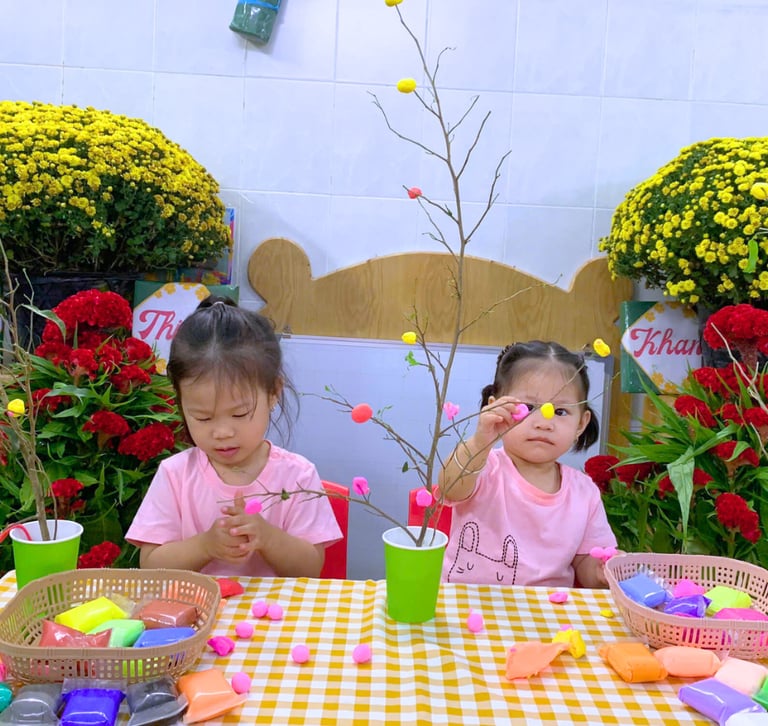 Từ những viên đất nặn ngũ sắc rực rỡ, các con khéo léo vo tròn, nặn nhỏ từng nụ hoa xinh xắn rồi tỉ mỉ gắn lên những cành cây khô. Qua đôi bàn tay nhỏ nhắn và sự sáng tạo hồn nhiên, những cành cây khô bỗng chốc khoác lên mình sắc xuân tươi mới, tràn đầy sức sống