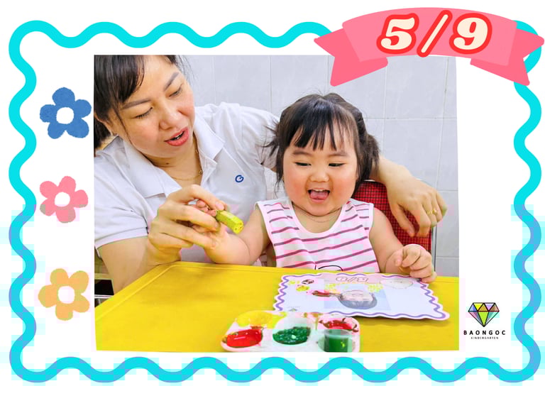 Hoạt động không chỉ giúp bé làm quen với đồ vật, rèn sự khéo léo qua việc quan sát, cầm nắm, chấm màu chính xác vào khoảng trống, mà còn mang lại thật nhiều niềm vui, sự hứng thú trong ngày đến trường đầu tiên. 🎨