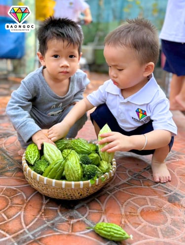 Các bé vô cùng thích thú khi quan sát những trái khổ qua với hình dạng và màu sắc khác nhau. Bé còn được biết rằng trái nào càng đèo, càng nhăn và xanh đậm thì vị sẽ càng đắng hơn. Không chỉ học hỏi thêm kiến thức về rau củ, các con còn rèn luyện kỹ năng quan sát, phân biệt và làm việc nhóm.