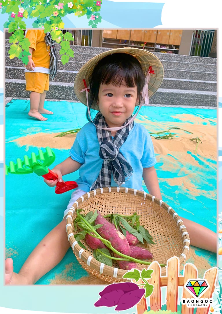 Các con cùng cô ra vườn và tự tay đào những củ khoai lang đang nằm dưới lớp đất mềm. Niềm vui hiện rõ trên gương mặt các bạn nhỏ khi từng củ khoai dần lộ ra. Bạn nào cũng háo hức quan sát, nhẹ nhàng đào đất và reo lên thích thú khi tìm được những củ khoai xinh xắn. Từ những bụi khoai xanh mướt, các bé được tận mắt nhìn thấy và hiểu thêm về quá trình cây khoai lang phát triển và cách thu hoạch.
