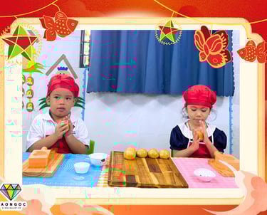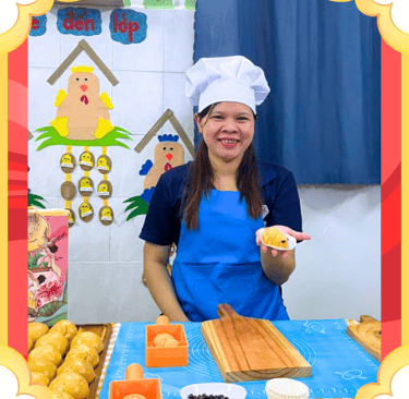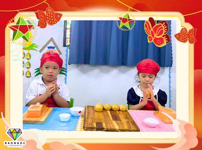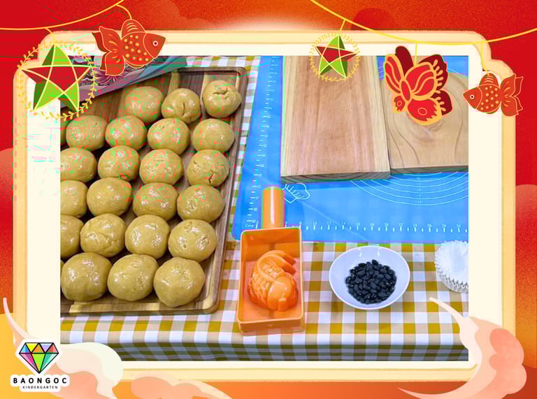 Thật ý nghĩa khi các con được tự tay mình làm chiếc bánh trung thu - chiếc bánh của sự đoàn viên, gắn kết. Tuy các con còn nhỏ, những công đoạn phức tạp như bao vỏ bánh cho nhân được sự giúp đỡ của cô nhưng con có thể cảm nhận được sự mềm mại, thơm béo của nhân dừa khi được vo viên nhân, cảm nhận viên bột sẽ có độ cứng hơn nhưng vẫn mềm dẻo và con thực hiện cán vỏ bằng dụng cụ ép gỗ, in khuôn những chiếc bánh trung thu cá chép xinh xắn.