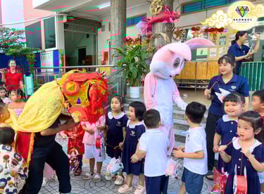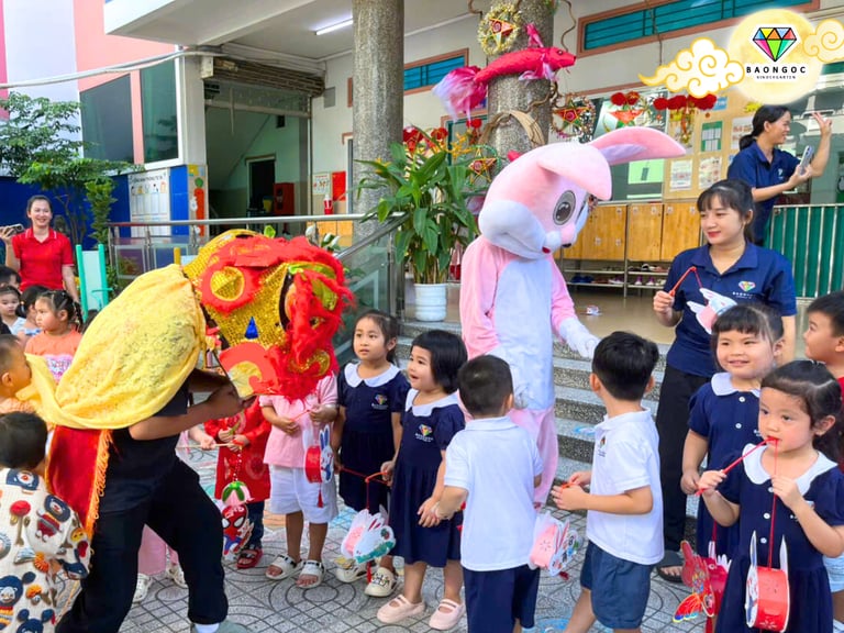 Các con được đón Tết trung thu đoàn viên vui vẻ, sôi động cùng với chú Cuội, chị Hằng Nga, và dàn Lân hùng hậu. Cứ mỗi lần âm thanh tiếng trống múa lân rộn rã vang ra, những chú Lân xuất hiện là các con reo hò phấn khích. Làm cho không khí của cả sân trường vui hơn bao giờ hết.