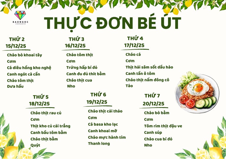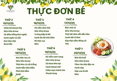Khẩu phần ăn phong phú đáp ứng dinh dưỡng và năng lượng cho bé hoạt động vui chơi và học tập một ngày.