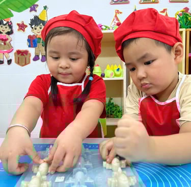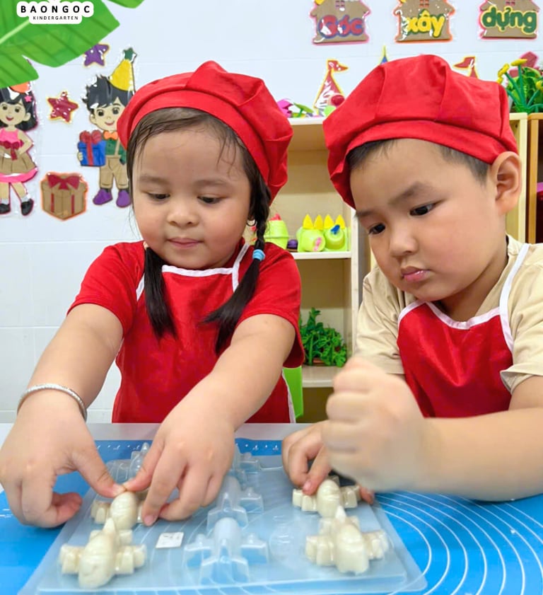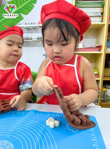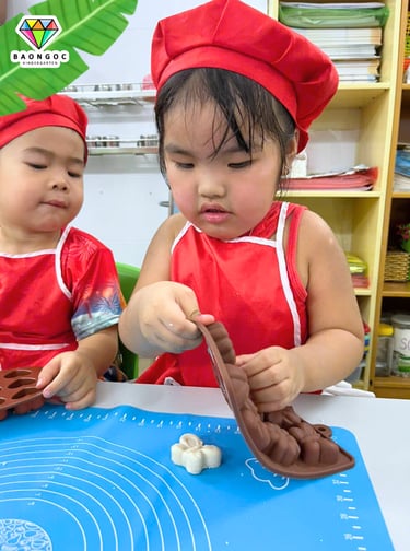 Chiếc bánh in mà các bé làm hôm nay mang vị mềm béo của nước cốt dừa, hòa quyện với độ ngọt ngọt, dẻo dẻo đặc trưng khiến bánh tan ngay trong miệng. Các cô đã hướng dẫn bé trộn bột sao cho đạt độ ẩm vừa đủ để có thể đóng khuôn, không quá khô cũng không quá nhão. Nhìn những đôi tay nhỏ xinh chăm chú nhấn khuôn, ai cũng thật khéo léo và hào hứng.